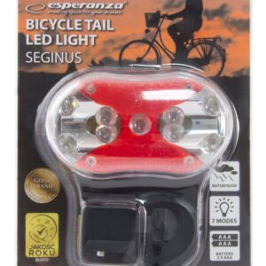 Lampa de bicicletă spate Esperanza SEGINUS are 9 LED-uri puternice care emit lumină roșie puternică. Datorită lămpii SEGINUS, veți fi foarte clar vizibil pentru ceilalți utilizatori de trafic după întuneric.Dispozitivul are 7 moduri de iluminare.Lampa are și o clemă, datorită căreia o puteți atașa cu ușurință pe haine sau rucsac.Fii vizibil pe drum!