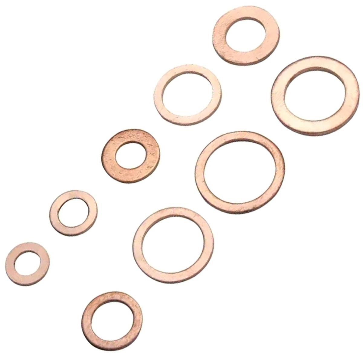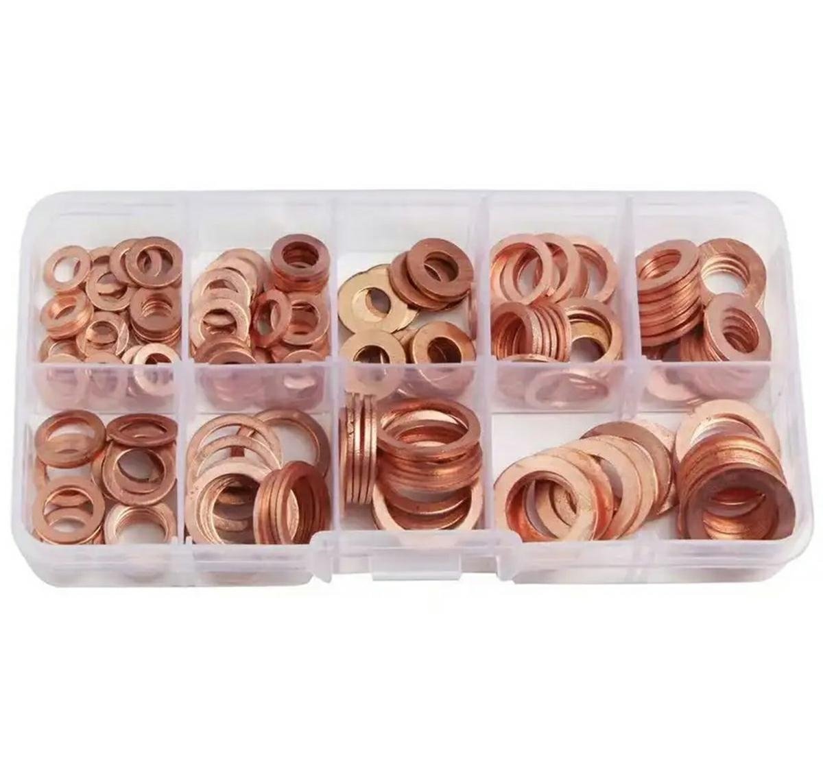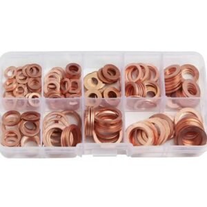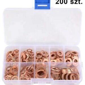Un set de 200 de șaibe din cupru împărțite în cele mai populare 9 dimensiuni. Saibele oferă o bună conductivitate electrică și termică. Funcționează grozav ca etanșare a dopului băii de ulei. Setul include o cutie practică cu compartimente cu o descriere a tuturor saibelor.