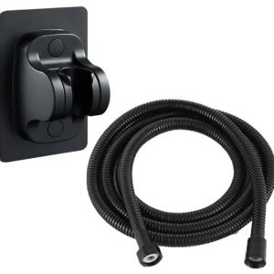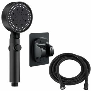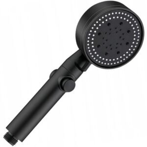 Cap de duș negru. Proiectat pentru instalare într-un furtun de duș standard. Receptorul are o funcție de selectare a modului de duș (5) și o funcție STOP care oprește fluxul. Ventilatorul încorporat mărește puterea dușului fără a crește consumul de apă. Setul include un furtun de duș dedicat cu lungimea de 150 cm și un suport de perete atașat cu bandă autoadezivă.