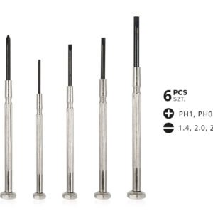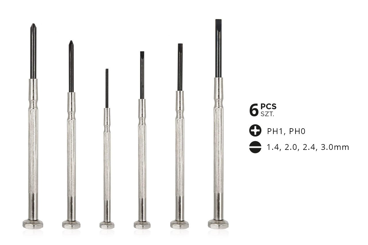 Setul contine cele mai uzuale surubelnite de acest tip: PH0 Phillips plus, PH1 Phillips plus, 1.4mm plata, 2.0mm plata, 2.4mm plata, 3.0mm plata.