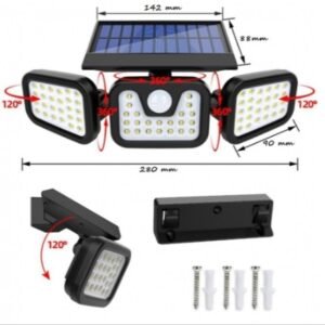 Lampa solară a fost proiectată pentru a garanta o cantitate mare de lumină folosind energie regenerabilă gratuită . 3 panouri LED echipate cu un total de 171 de diode COB asigura iluminarea corecta a spatiului de pana la 50m2 .