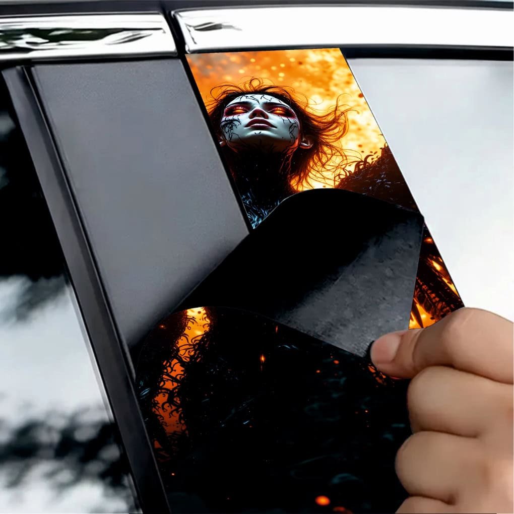 Set 2 folii printate outdoor pentru colantarea stâlpilor ușilor autoturismului dvs. Folia imprimată cu EcoSolvent Outdoor aderă pe orice suprafață plană, netedă. În cazul suprafețelor rugoase, aderența produsului va scadea considerabil.