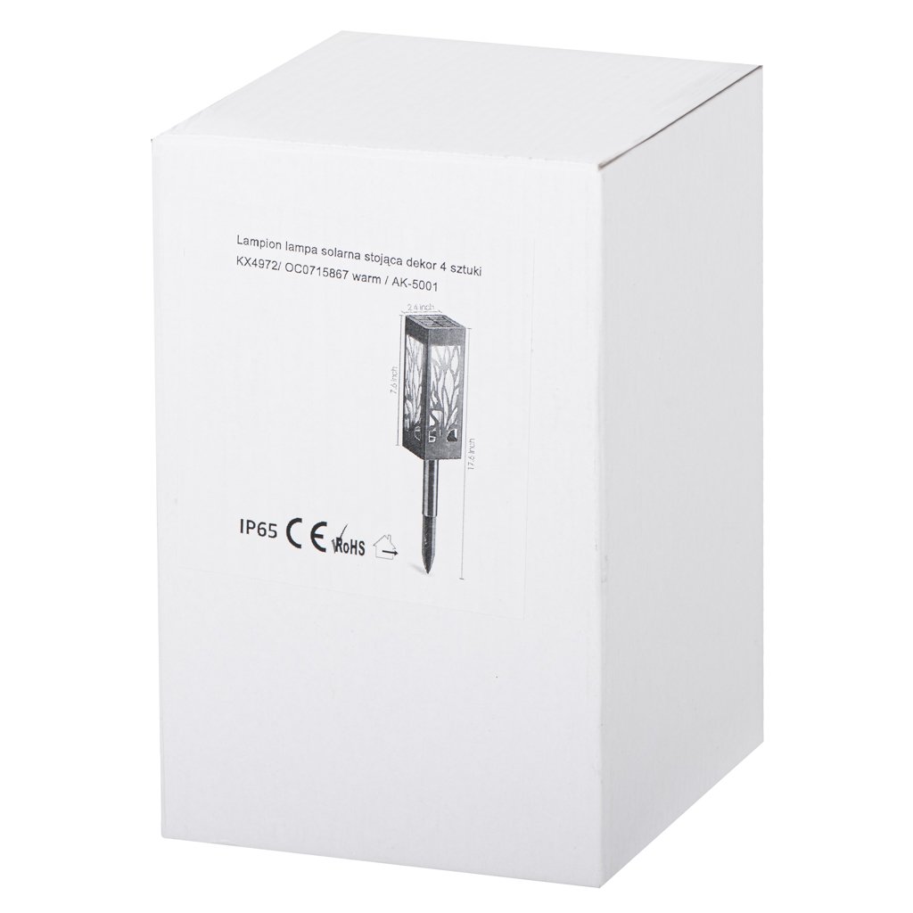 Lămpi solare de grădină pentru a fi introduse în pământ ambalate într-o cutie de carton.